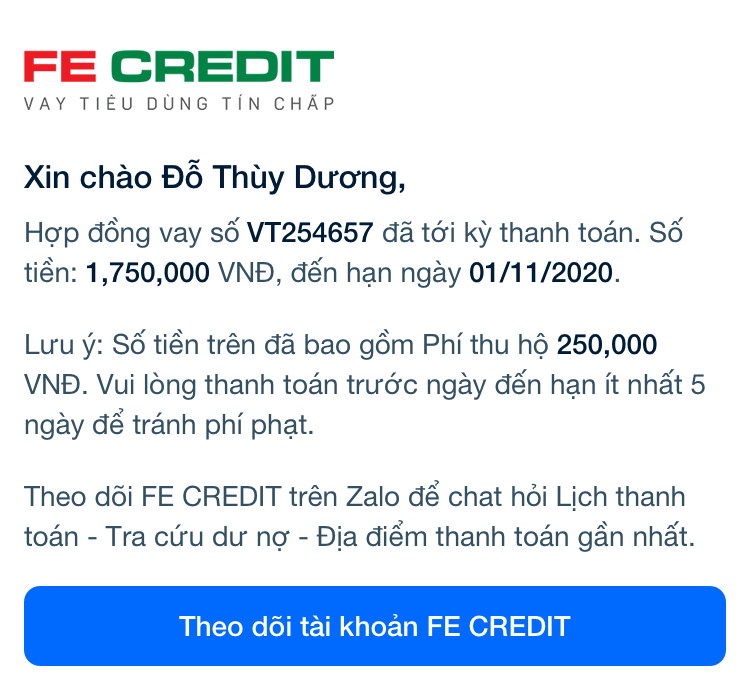 • Thông báo đến hạn thanh toán khoản vay tài chính